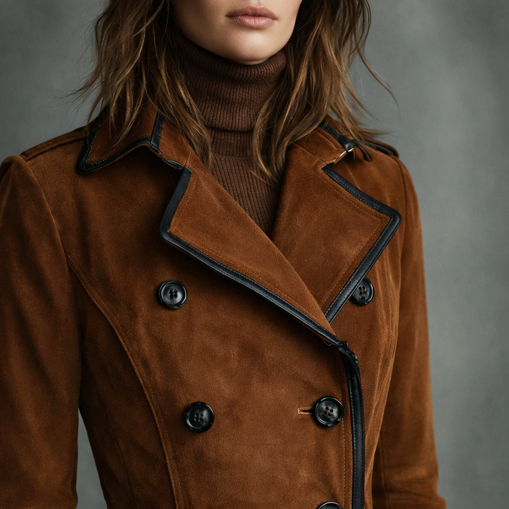 Un cappotto lungo in texture effetto suede dal design doppiopetto con cintura in vita. Valorizza la silhouette grazie ai dettagli sartoriali ed è perfetto per un look elegante e quotidiano nelle stagioni fredde.