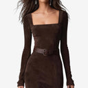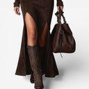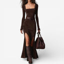 Questo abito scenografico cattura immediatamente l'attenzione con la sua sorprendente scollatura quadrata e la lussuosa texture effetto suede opaco, creando un look di sofisticata naturalezza con venature western. Realizzato in un materiale morbido e pregiato che cade magnificamente, l'abito presenta un corpetto aderente e lusinghiero e uno spacco profondo che consente movimenti spettacolari e una silhouette scolpita. Il capo evoca una sensazione di potente eleganza romantica, perfetta per distinguersi in un contesto artistico di alto livello. Il suo stile versatile si abbina perfettamente a stivali alti per un look da giorno raffinato o a tacchi per una serata distintiva.